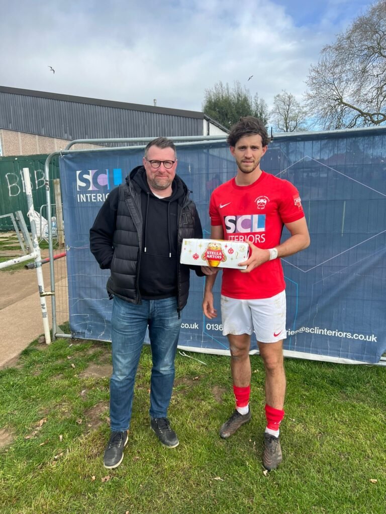 Adam Nurse of matchday sponsor SCL Interiors presents MOTM Jake Miller with his beers